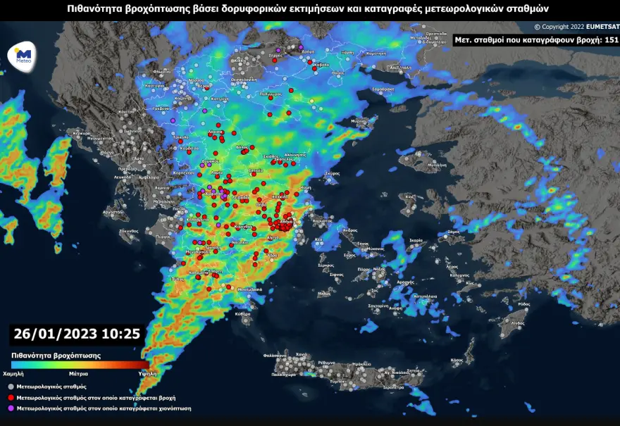 Στην εικόνα που ακολουθεί παρουσιάζονται οι περιοχές όπου υπήρξε πιθανότητα βροχόπτωσης/χιονόπτωσης καθώς και οι σταθμοί όπου καταγράφηκε βροχόπτωση/χιονόπτωση κατά το διάστημα 10:10 – 10:25 της Πέμπτη 26/01.