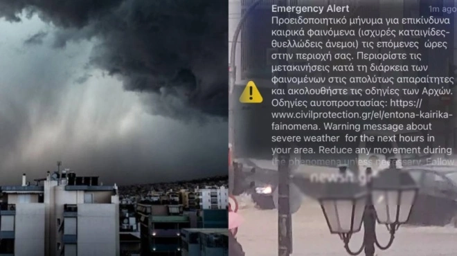 Στο μήνυμα που έφτασε στα τηλέφωνα των πολιτών αναγράφεται: «Προειδοποιητικό μήνυμα για επικίνδυνα καιρικά φαινόμενα (ισχυρές καταιγίδες – θυελλώδεις άνεμοι) στην περιοχή σας τις επόμενες ώρες. Περιορίστε τις μετακινήσεις κατά τη διάρκεια των φαινομένων στις απολύτως απαραίτητες οδηγίες και ακολουθήστε τις οδηγίες των Αρχών».