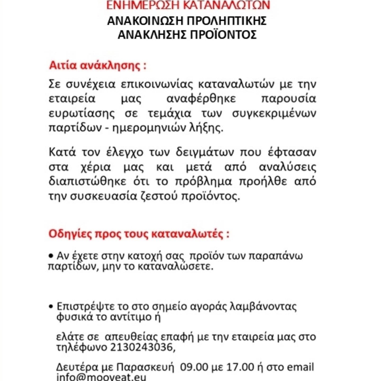 Ειδικότερα σύμφωνα με σχετική ανακοίνωση που εξέδωσε η εταιρεία και σε σχετική προειδοποίηση που αναρτήθηκε στο Ευρωπαϊκό Σύστημα Ταχείας ειδοποίησης για επικίνδυνα τρόφιμα RASFF (Rapid Alert System for Food and Feed) η ανάκληση υπαγορεύεται για λόγους ασφάλειας των καταναλωτών.