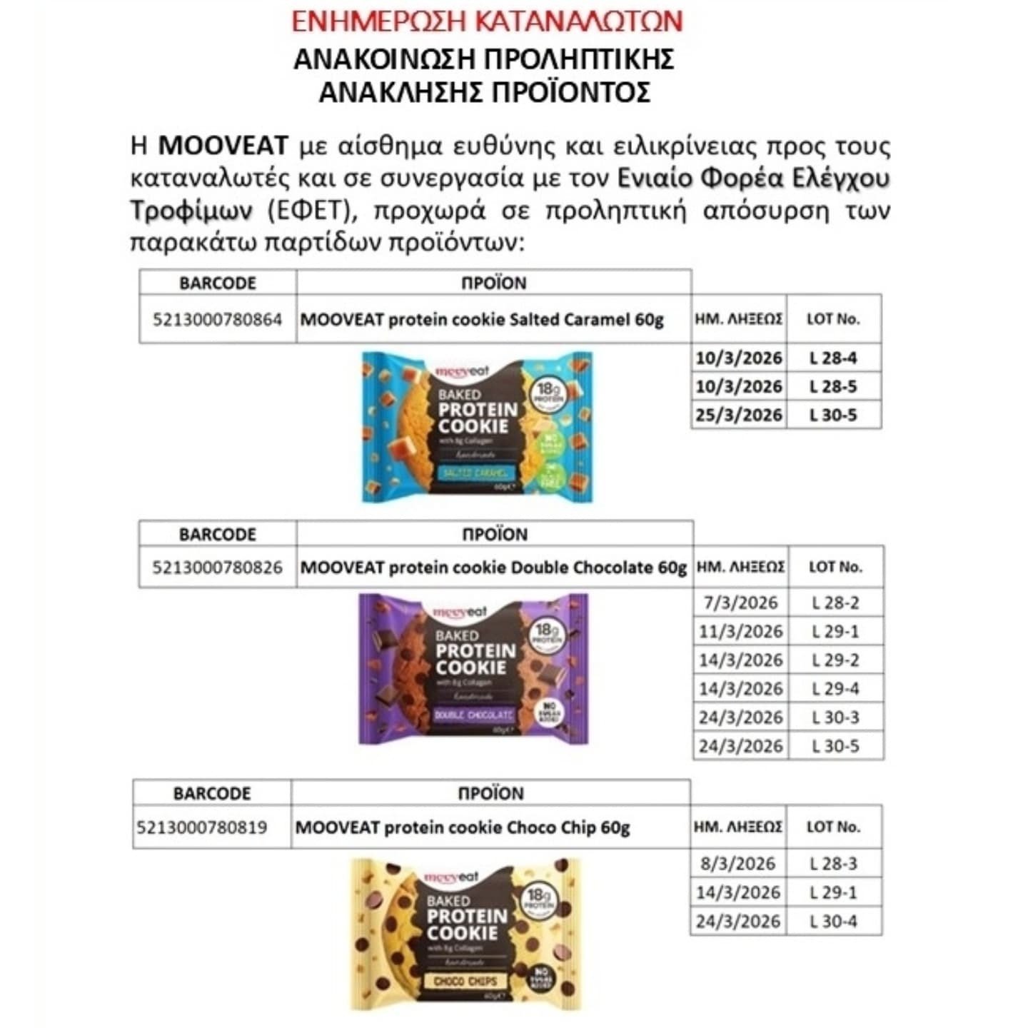 Ανακαλούνται γνωστά μπισκότα πρωτεΐνης από την ελληνική αγορά σύμφωνα με ανακοίνωση της εταιρείας MOOVeat.