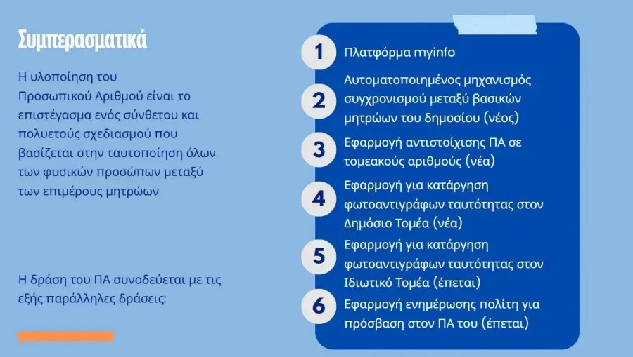 Μέχρι σήμερα, οι πολίτες διέθεταν τέσσερις διαφορετικούς αριθμούς ταυτοποίησης. Πλέον, με τον Π.Α., διασφαλίζεται ότι στα βασικά μητρώα του κράτους τηρούνται τα ίδια, επιβεβαιωμένα και ορθά στοιχεία για κάθε πολίτη, με απόλυτο σεβασμό και προστασία των προσωπικών δεδομένων.
