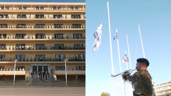 Το τιμητικό άγημα προχώρησε σε έπαρση της σημαίας, η οποία αφού ανέβηκε στον ιστό, κατέβηκε και πάλι στη μέση και θα κυματίζει μεσίστια μέχρι να ολοκληρωθούν οι ημέρες πένθους των Ενόπλων Δυνάμεων.