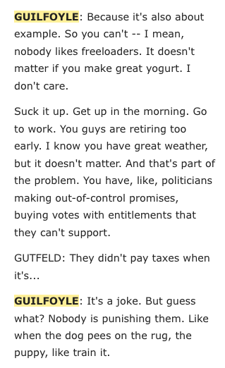 When the Greek public voted down a bailout offer from European creditors in a July 2015 referendum, Kimberly Guilfoyle called them “freeloaders” who need to “suck it up” and stop “retiring too early.” She also suggested they should be punished like a dog who pees on the rug. pic.twitter.com/shDtheGan1