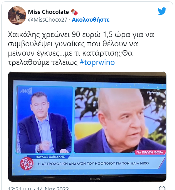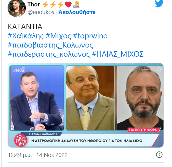«Ο Ηλίας Μίχος είναι ένας άνθρωπος που αυτή την περίοδο θέλει πολύ σεξ. Το σεξ παίζει σημαντικό ρόλο στη ζωή του. Για ό,τι συνέβη φταίει ο Κρόνος. Θα παιχτούν πολλά παιχνίδια στην υπόθεση Μίχου. Μάλιστα, όπως θα δείτε στο μέλλον, θα πέσει στα “μαλακά”», ανέφερε μεταξύ άλλων σε βίντεο που προβλήθηκε στο «Πρωινό».