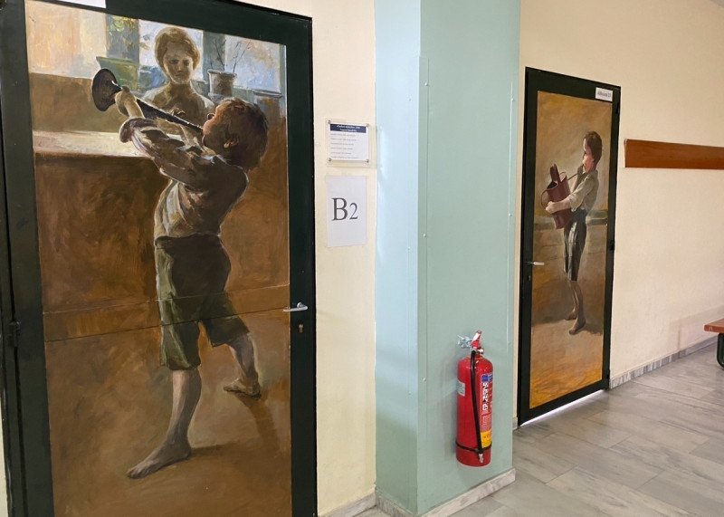 Οι ζωγραφικοί πίνακες που κοσμούν τις εισόδους των αιθουσών και «ταξιδεύουν» τους μαθητές στον κόσμο της τέχνης είναι το αποτέλεσμα του πρωτότυπου εγχειρήματος «Μια πόρτα στην Τέχνη», που υλοποιήθηκε με τη βοήθεια των μαθητών, από τον γνωστό εικαστικό Κώστα Κουτρουμπή, που διδάσκει στο συγκεκριμένο σχολείο.