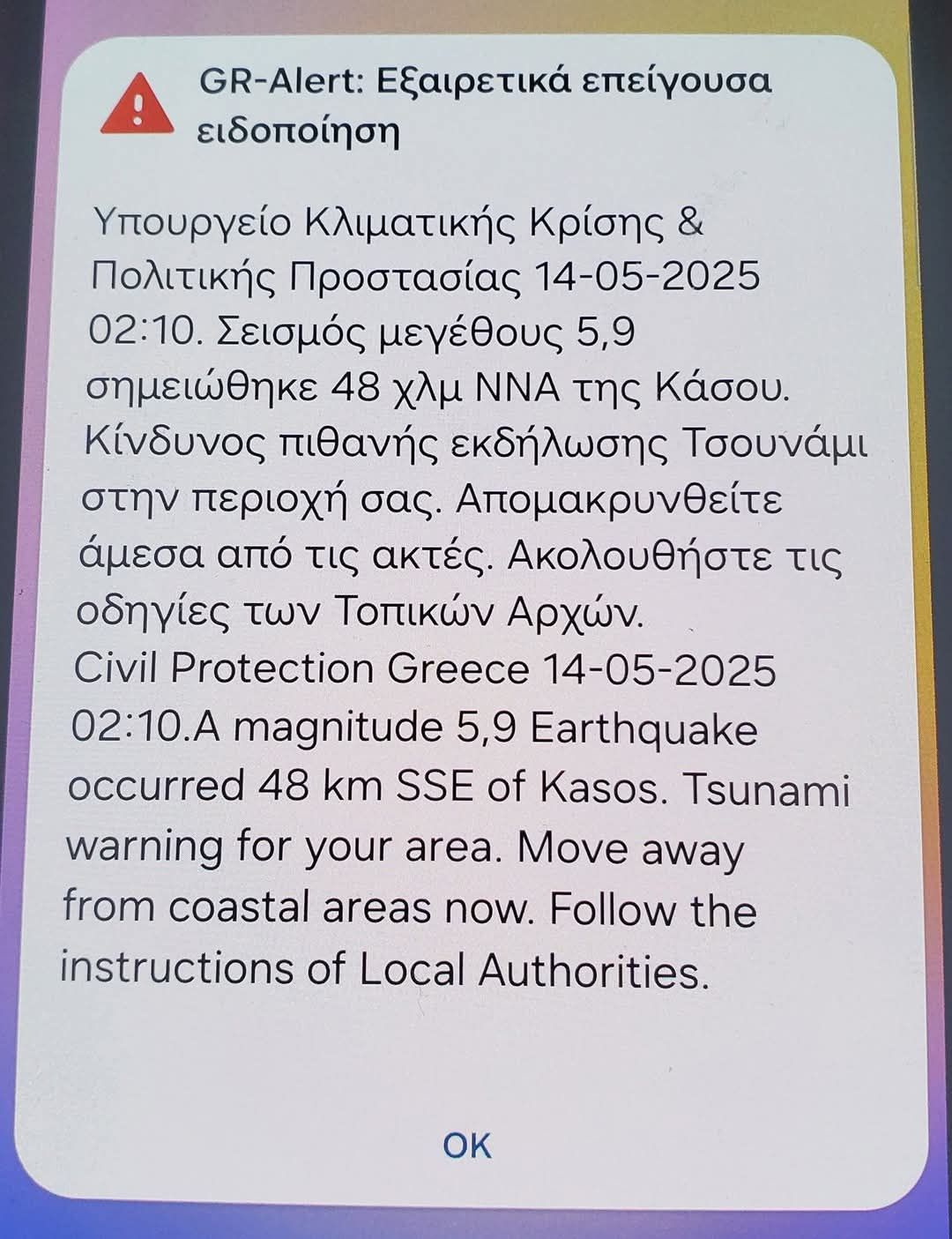 Ωστόσο, εστάλη μήνυμα από το 112 που κάνει λόγο για κίνδυνο πιθανής εκδήλωσης τσουνάμι στην περιοχή. Ζητείται, δε, από τους κατοίκους των περιοχών γύρω από το επίκεντρο του σεισμού να απομακρυνθούν από τις ακτές.