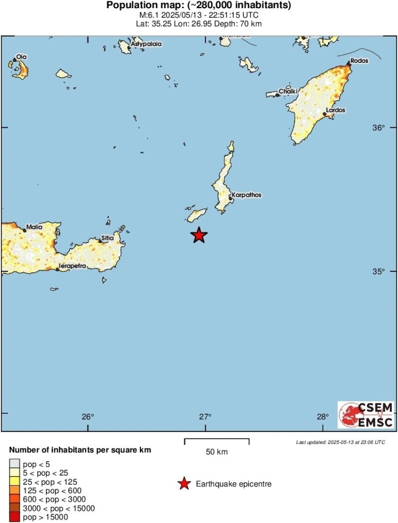 «Πολύ ισχυρός» σεισμός μεγέθους 6,0 βαθμών της κλίμακας Ρίχτερ, σημειώθηκε στη 01:51 μετά τα μεσάνυχτα (Τετάρτη 14/5), στον θαλάσσιο χώρο 19 χιλιόμετρα νότια-νοτιοδυτικά της Κάσου και ανατολικά της Κρήτης, σε εστιακό βάθος 35 χιλιομέτρων, σύμφωνα με την ανακοίνωση του Γεωδυναμικού Ινστιτούτου του Εθνικού Αστεροσκοπείου της Αθήνας.