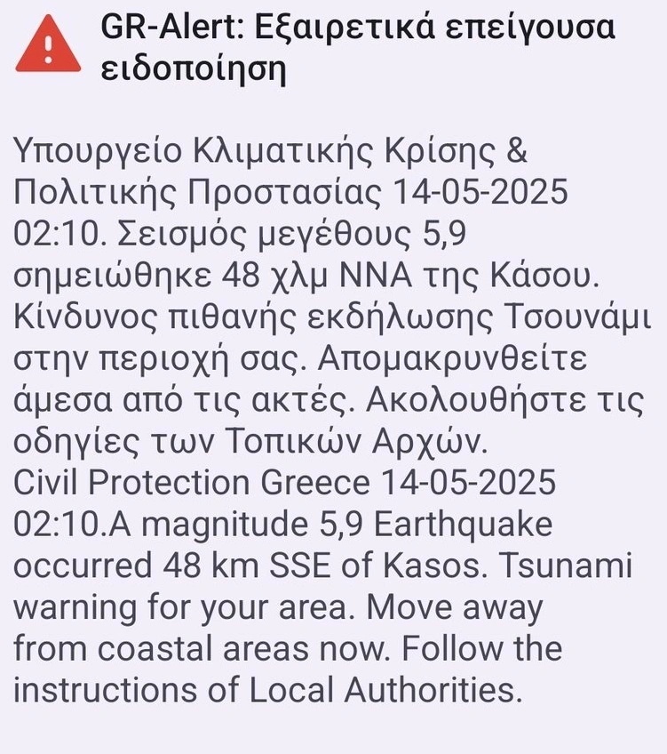 Υπουργείο Κλιματικής Κρίσης & Πολιτικής Προστασίας 14-05-2025 02:10. Σεισμός μεγέθους 5,9 σημειώθηκε 48 χλμ ΝΝΑ της Κάσου. Κίνδυνος πιθανής εκδήλωσης Τσουνάμι στην περιοχή σας. Απομακρυνθείτε άμεσα από τις ακτές. Ακολουθήστε τις οδηγίες των Τοπικών Αρχών».