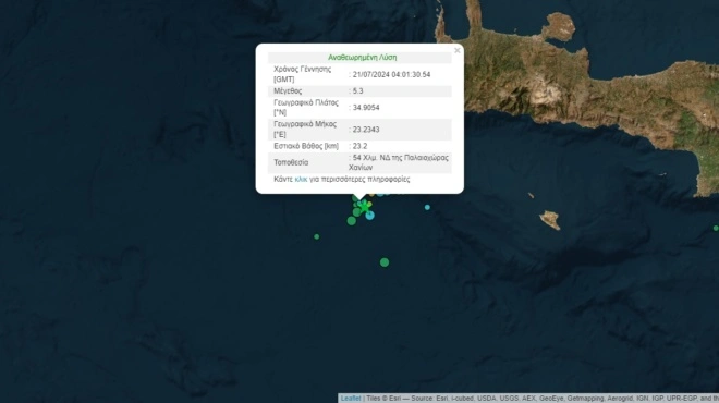 Κρήτη: Σεισμός τώρα 5,3 Ρίχτερ νοτιοδυτικά της Παλαιοχώρας Χανίων