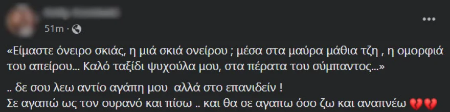«”Είμαστε όνειρο σκιάς, η μιά σκιά ονείρου ; μέσα στα μαύρα μάθια τζη , η ομορφιά του απείρου… Καλό ταξίδι ψυχούλα μου, στα πέρατα του σύμπαντος…”