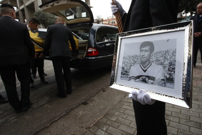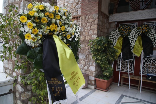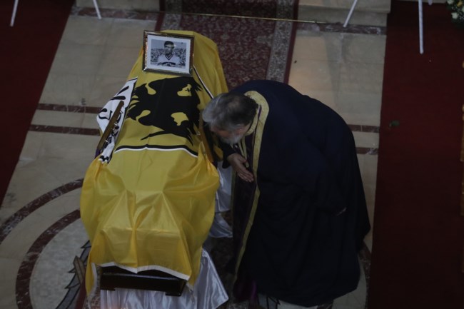 Το φέρετρο του σπουδαίου αθλητή έφτασε στον ιερό Ναό Αγίας Τριάδας, στη Νέα Φιλαδέλφεια – όπου τέθηκε σε λαϊκό προσκύνημα – τυλιγμένο με τη σημαία της ΑΕΚ.