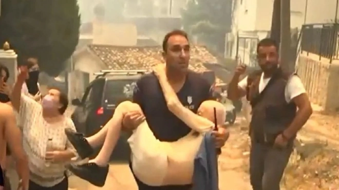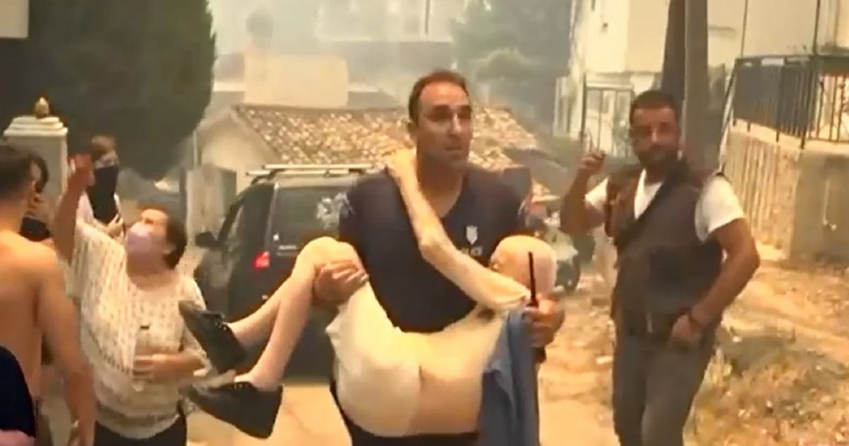 Η κάμερα του Mega κατέγραψε τη στιγμή που αστυνομικός έχει πάρει στην αγκαλιά του έναν ηλικιωμένο άνδρα και τον μεταφέρει μακριά από τη φωτιά.