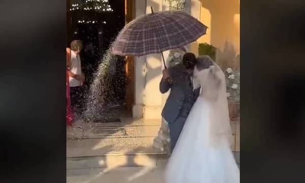 Μάλιστα, ο γαμπρός άνοιξε ομπρέλα, ώστε να γλιτώσει από την «επίθεση», ενώ προσπάθησε μάταια να προστατέψει και τη σύζυγό του, η οποία άπλωσε τα πέπλα της, προσπαθώντας κι αυτή να προστατευτεί.