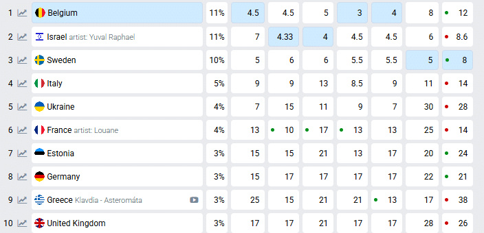 Η κατάταξη των στοιχημάτων για τον μεγάλο νικητή της Eurovision 2025 είναι ιδιαίτερα αμφίρροπη. Σύμφωνα με το Eurovisionworld.com, το Βέλγιο και το Ισραήλ να βρίσκονται στην κορυφή με 11% πιθανότητες νίκης, ενώ η Σουηδία ακολουθεί με 10%.