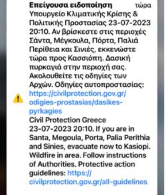 Στην πυρκαγιά που έχει ξεσπάσει στη βόρεια Κέρκυρα δόθηκε 112 για εκκένωση από τους οικισμούς Πόρτες, Μεγκουλα, Σημιές, Παλιά Περιθεια και Σάγκα προς Κασσιόπη.