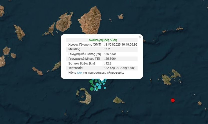 Η δεύτερη σεισμική δόνηση είχε επίκεντρο 26 χλμ. βορειοανατολικά της Οίας, μέγεθος 2,5 Ρίχτερ και εστιακό βάθος 15,1 χλμ.
