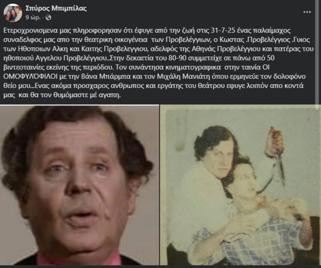 «Ετεροχρονισμένα μας πληροφόρησαν ότι έφυγε από τη ζωή στις 31-7-25 ένας παλαίμαχος συνάδελφος μας από τη θεατρική οικογένεια των Προβελέγγιων, ο Κώστας. Προβελέγγιος. Γιος των Ηθοποιών Αλκή και Καίτης Προβελλέγγιου, αδελφός της Αθηνάς Προβελέγγιου και πατέρας του ηθοποιού Άγγελου Προβελέγγιου..