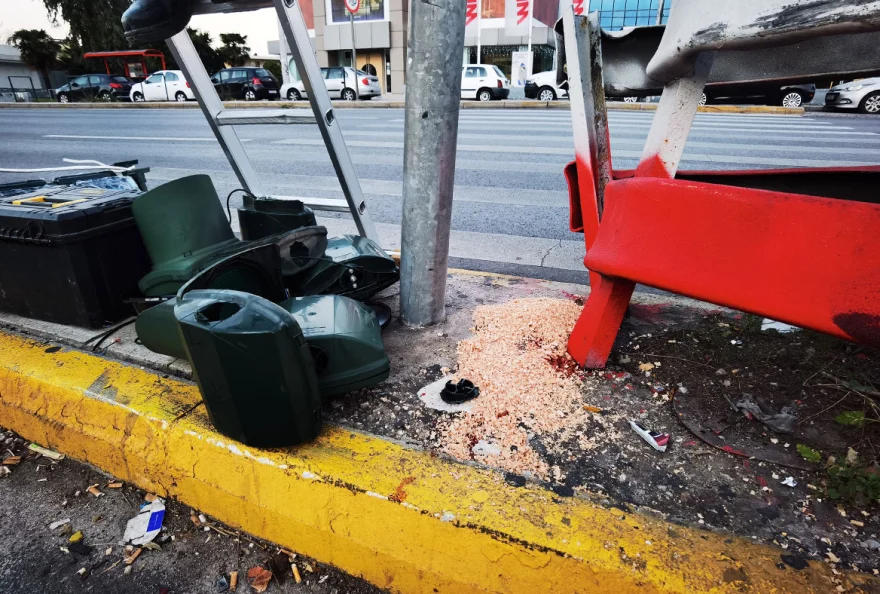Σύμφωνα με πληροφορίες η μηχανή έπεσε με μεγάλη ταχύτητα στο φωτεινό σηματοδότη γκρεμίζοντας την κολόνα.