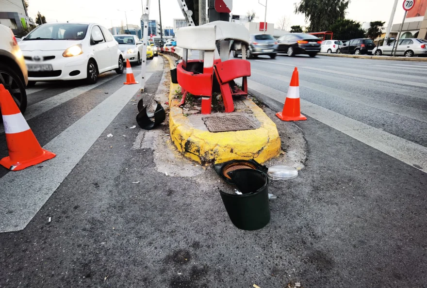 Σύμφωνα με πληροφορίες η μηχανή έπεσε με μεγάλη ταχύτητα στο φωτεινό σηματοδότη γκρεμίζοντας την κολόνα.