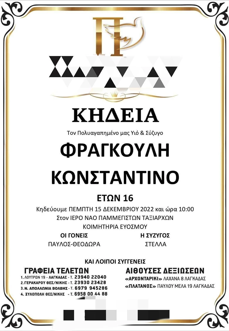Η κηδεία θα τελεστεί αύριο το πρωί στον Ιερό Ναό Παμμεγίστων Ταξιαρχών ενώ η ταφή του στα Κοιμητήρια του Ευόσμου αναφέρει το grtimes.