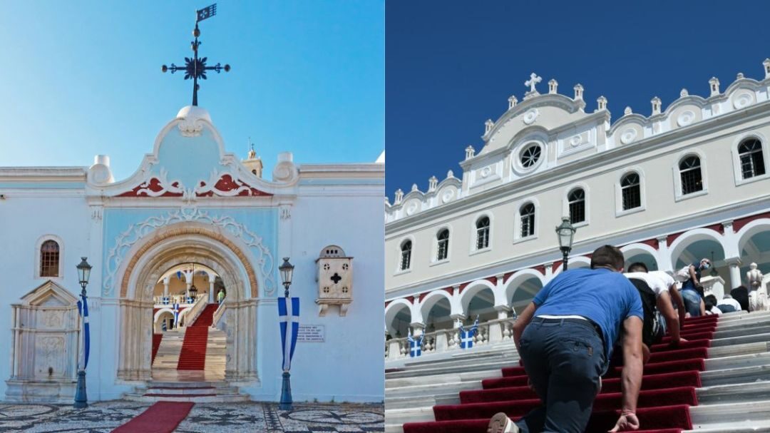 Οι προσκυνητές έχουν ήδη φτάσει στο νησί και περιμένουν στον περίβολο της εκκλησίας ενώ πολλοί είναι εκείνοι που εκπληρώνουν το τάμα τους και έρχονται με τα γόνατα από το λιμάνι.