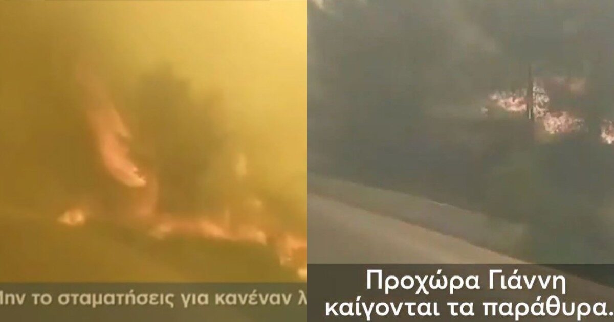 Περνάει μέσα από τις φλόγες και ο ένας από τους εθελοντές προσπαθεί να κατευθύνει τον οδηγό. «Δεξιά πάει ο δρόμος, Δεξιά πάει ο δρόμος, ευθεία. Προχώρα το προχώρα το. Από πάνω μας είναι η φωτιά στα δέντρα. Προχώρα. Μην το σταματήσεις για κανέναν λόγο. Προχώρα Γιάννη, καίγονται τα παράθυρα», φωνάζει.