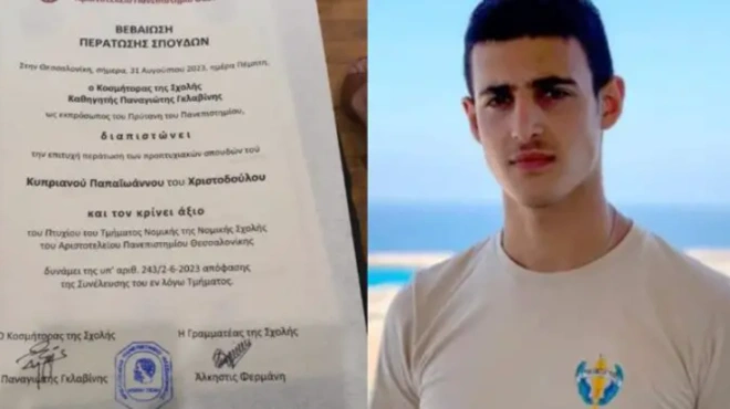 Έξι μήνες μετά το τραγικό σιδηροδρομικό δυστύχημα στα Τέμπη, όπου ο 23χρονος έχασε τη ζωή του μαζί με άλλα 56 επιβάτες, η Εύα παρέλαβε τη βεβαίωση που αναγράφει ότι κρίνεται άξιος του πτυχίου του Τμήματος Νομικής της Νομικής Σχολής του Αριστοτέλειου Πανεπιστημίου Θεσσαλονίκης.