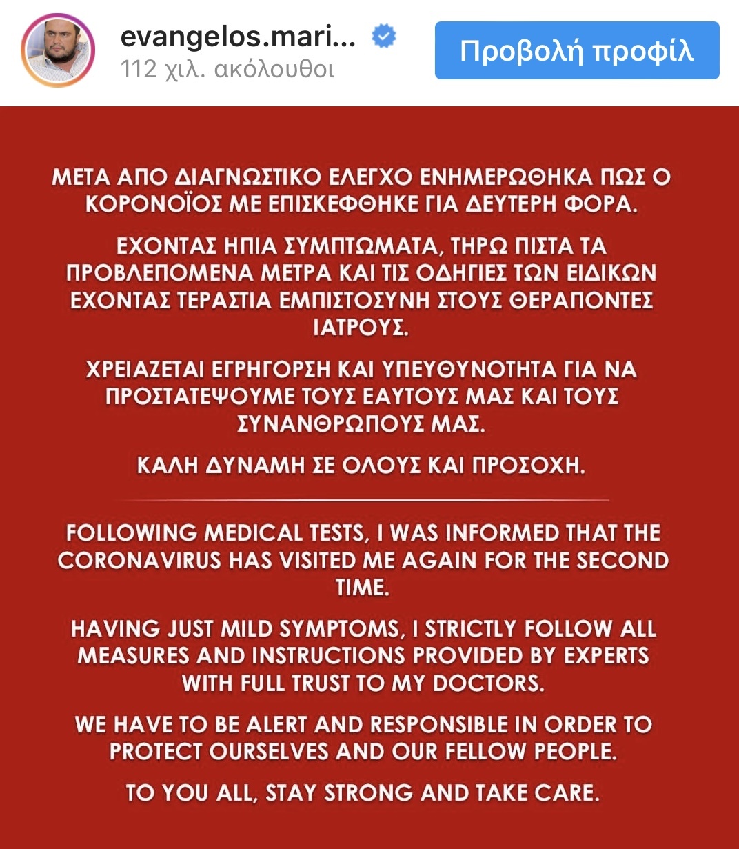 «Μετά από διαγνωστικό έλεγχο ενημερώθηκα πως ο κορωνοϊός με επισκέφθηκε για δεύτερη φορά. Εχοντας ήπια συμπτώματα, τηρώ πιστά τα προβλεπόμενα μέτρα και τις οδηγίες των ειδικών έχοντας τεράστια εμπιστοσύνη στους θεράποντες ιατρούς.