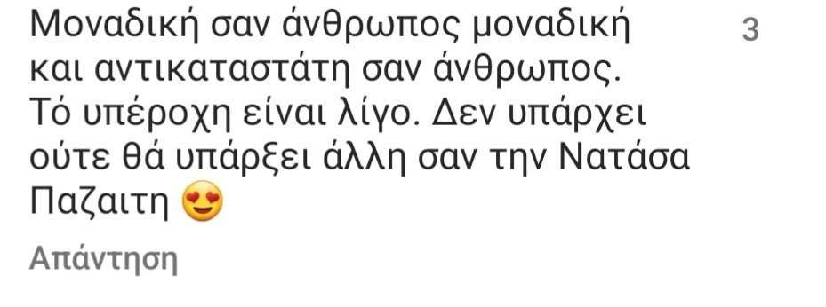 Φυσικά τα σχόλια στις φωτογραφίες για το έργο της ως γιατρός ήταν πολλά, με τους περισσότερους να γράφουν πόσο «υπέροχη άνθρωπος και γιατρός» είναι, ενώ υπήρχαν και γυναίκες που η Νατάσα Παζαΐτη έτυχε να κουράρει, οι οποίες έγραψαν πως αισθάνθηκαν πολύ «τυχερές» που βρέθηκε στον δρόμο τους.