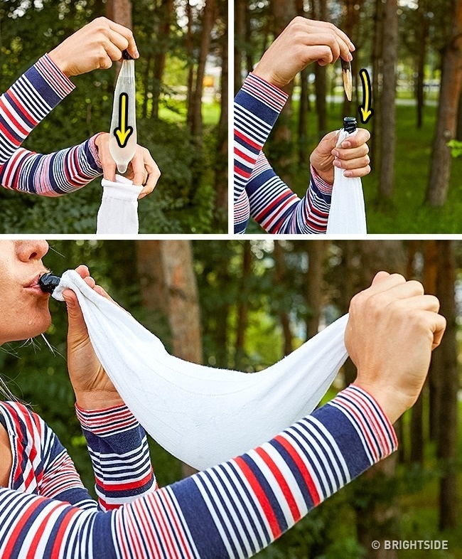 Το προφυλακτικό είναι αποστειρωμένο και δυνατό. Σε περίπτωση ανάγκης, μπορείτε να αποθηκεύσετε νερό σε αυτό. Βάλτε ένα μικρό σωλήνα στο λαιμό, ρίξτε λίγο νερό στο προφυλακτικό και τοποθετήστε το σε μια κάλτσα.