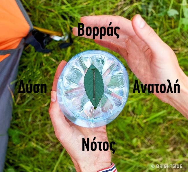 Πάρτε μια βελόνα και τρίψτε την στο τζιν σας ή κάποια άλλη σκληρή επιφάνεια. Στην συνέχεια, τοποθετήστε την πάνω στο φύλλο στο νερό. Η μεριά που τρίψατε θα δείχνει τον βορρά.
