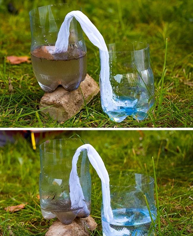 Βάλτε το δοχείο με το βρώμικο νερό σε μια ανυψωμένη επιφάνεια και από κάτω του ένα άδειο δοχείο. Σκίστε ένα κομμάτι ύφασμα και βάλτε την μια άκρη στο δοχείο με το βρώμικο νερό και την άλλη στο άδειο δοχείο. Για να είστε σίγουροι είναι καλύτερο να βράσετε το νερό.