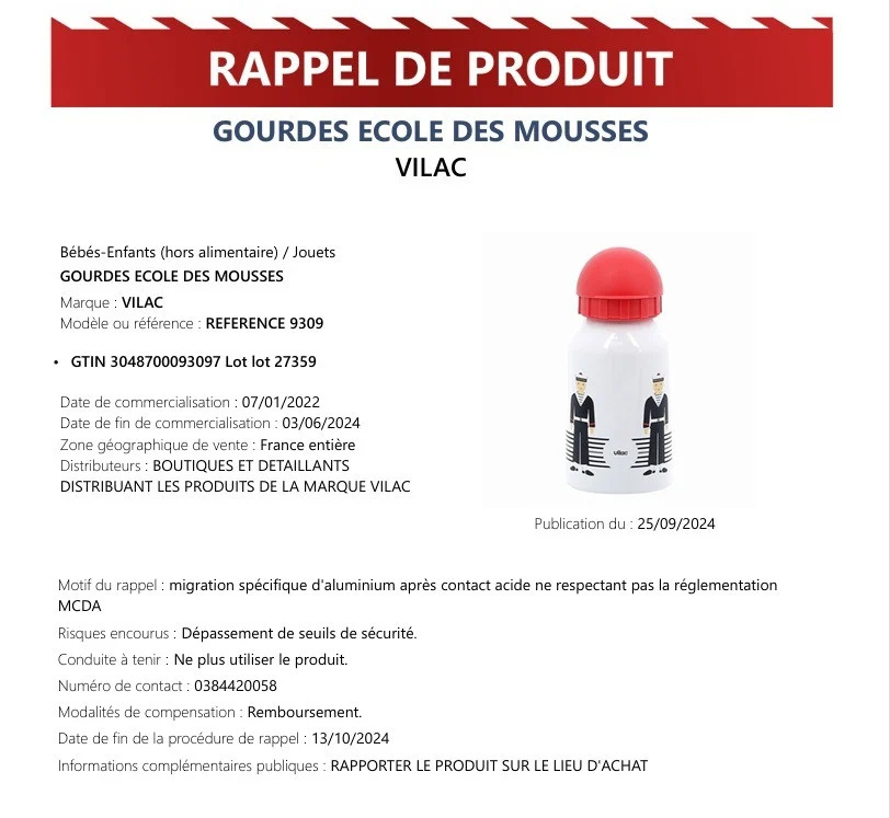 Ειδικότερα οι Αρχές της Γαλλίας διέταξαν την ανάκληση των παρτίδων 3048700093097 lot 27359 του παγουριού για παιδιά GOURDES ECOLE DES MOUSSES της μάρκας VILAC που πωλήθηκαν το διάστημα μεταξύ 07/01/2022 μέχρι και 03/06/2024 καθώς ανιχνεύθηκε ποσότητα απελευθέρωσης αλουμινίου μετά από επαφή με οξύ που δεν συμμορφώνεται με τους κανονισμούς MCDA.