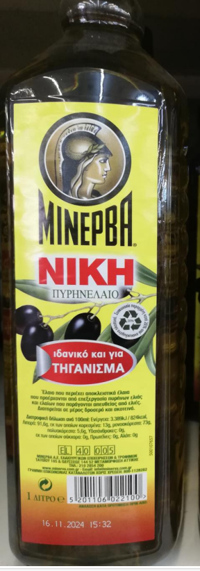 Ο Ε.Φ.Ε.Τ. και ειδικότερα η Περιφερειακή Διεύθυνση Δυτικής Ελλάδας, στο πλαίσιο του Προγράμματος «Επίσημος Έλεγχος για την παρακολούθηση παρουσίας Πολυκυκλικών Υδρογονανθράκων (ΠΑΥ) σε ορισμένα είδη τροφίμων», προέβη σε δειγματοληψία τροφίμου με τα στοιχεία: “ΜΙΝΕΡΒΑ ΝΙΚΗ ΠΥΡΗΝΕΛΑΙΟ”, ΑΝΑΛΩΣΗ ΚΑΤΑ ΠΡΟΤΙΜΗΣΗ ΠΡΙΝ ΑΠΟ: 16.11.2024. Υπεύθυνη για την κυκλοφορία του προϊόντος εταιρεία, σύμφωνα με την ετικέτα επισήμανσής του, είναι η επιχείρηση «ΜΙΝΕΡΒΑ Α.Ε. ΕΛΑΙΟΥΡΓΙΚΩΝ ΕΠΙΧΕΙΡΗΣΕΩΝ & ΤΡΟΦΙΜΩΝ».