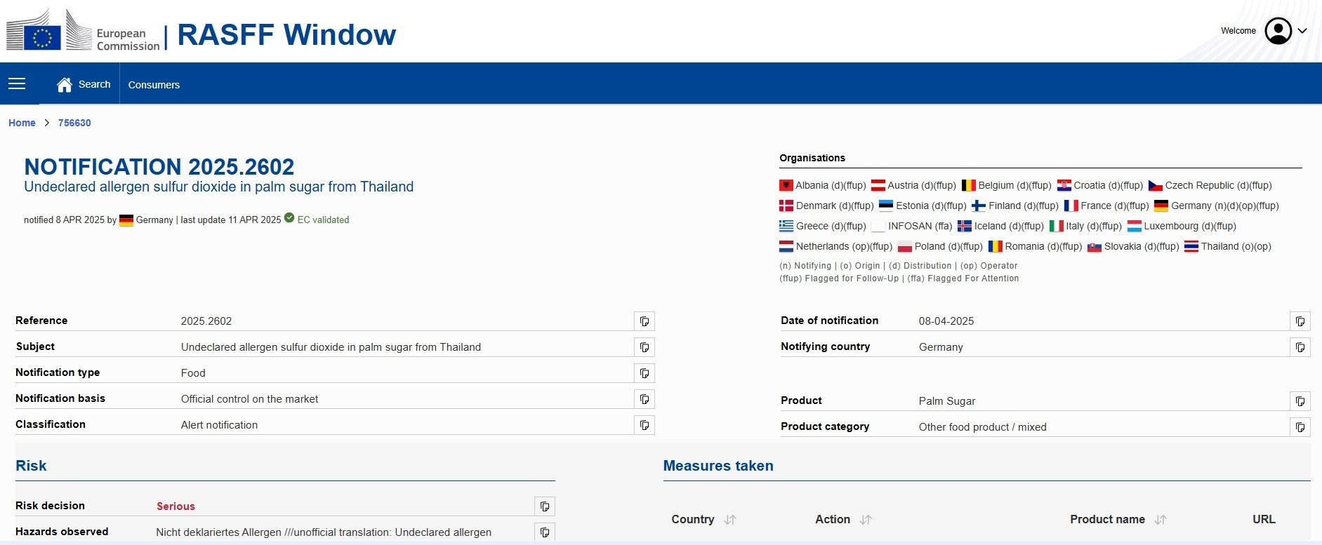 Σύμφωνα με την ειδοποίηση ανάκλησης που δημοσιεύτηκε στο Ευρωπαϊκό Σύστημα Ταχείας ειδοποίησης για επικίνδυνα τρόφιμα RASFF (Rapid Alert System for Food and Feed) ανακαλείται ζάχαρη φοίνικα λόγω παρουσίας θειώδους άλατος που δεν αναγράφεται στην ετικέτα.