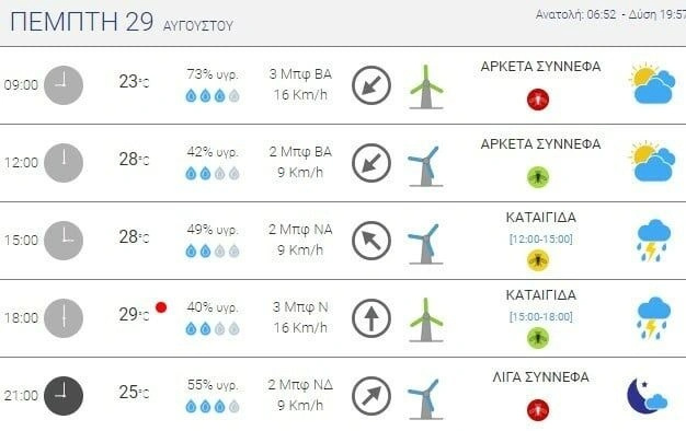 Όπως φαίνεται και στον πίνακα του meteo, καταιγίδα αναμένεται από τις 15:00 το μεσημέρι έως και τις 18: 00 στα βόρεια του νομού της Αττικής.