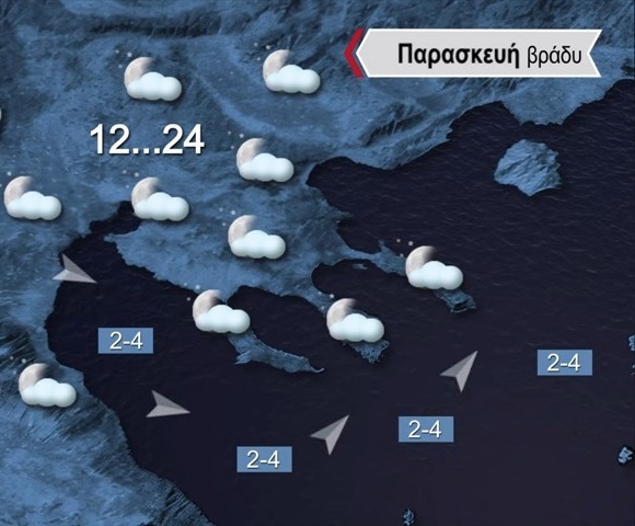 - Άνεμοι: Δυτικοί βορειοδυτικοί 3 με 5 και στο Ιόνιο τοπικά 6 μποφόρ.