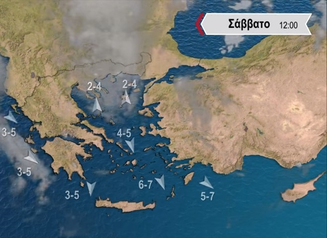 - Οι άνεμοι θα πνέουν από βόρειες διευθύνσεις 3 με 5 και στο νοτιοανατολικό Αιγαίο 5 με 6 και τοπικά 7 μποφόρ.