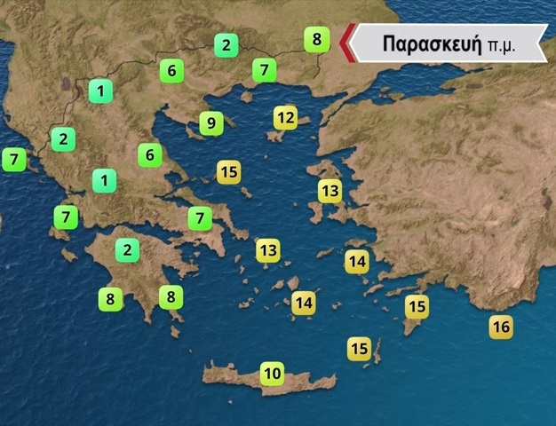 - Θερμοκρασία: Έως 25 βαθμούς Κελσίου. Στη δυτική Μακεδονία 3 με 4 βαθμούς χαμηλότερη.