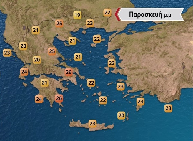 - Η θερμοκρασία δεν θα σημειώσει αξιόλογη μεταβολή. Θα φτάσει στα ηπειρωτικά τους 24 με 26 βαθμούς και στη νησιωτική χώρα τους 22 με 24 βαθμούς και κατά τόπους στο νοτιοανατολικό Αιγαίο και την Κρήτη τους 25 βαθμούς Κελσίου.
