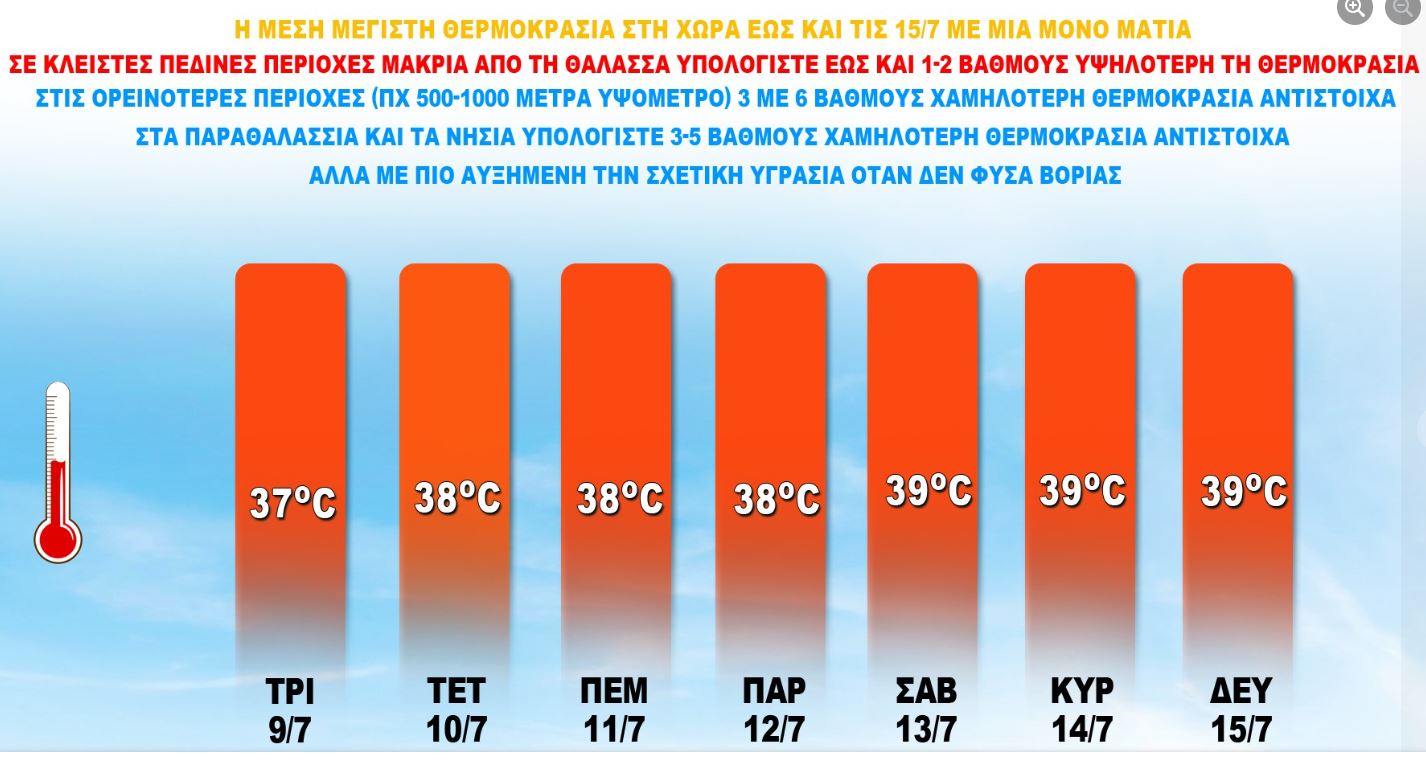 Όπως φαίνεται στη φωτογραφία οι πιο ζεστές ημέρες θα είναι από τις 13 έως τις 15 Ιουλίου με τον υδράργυρο να χτυπά 39άρια.