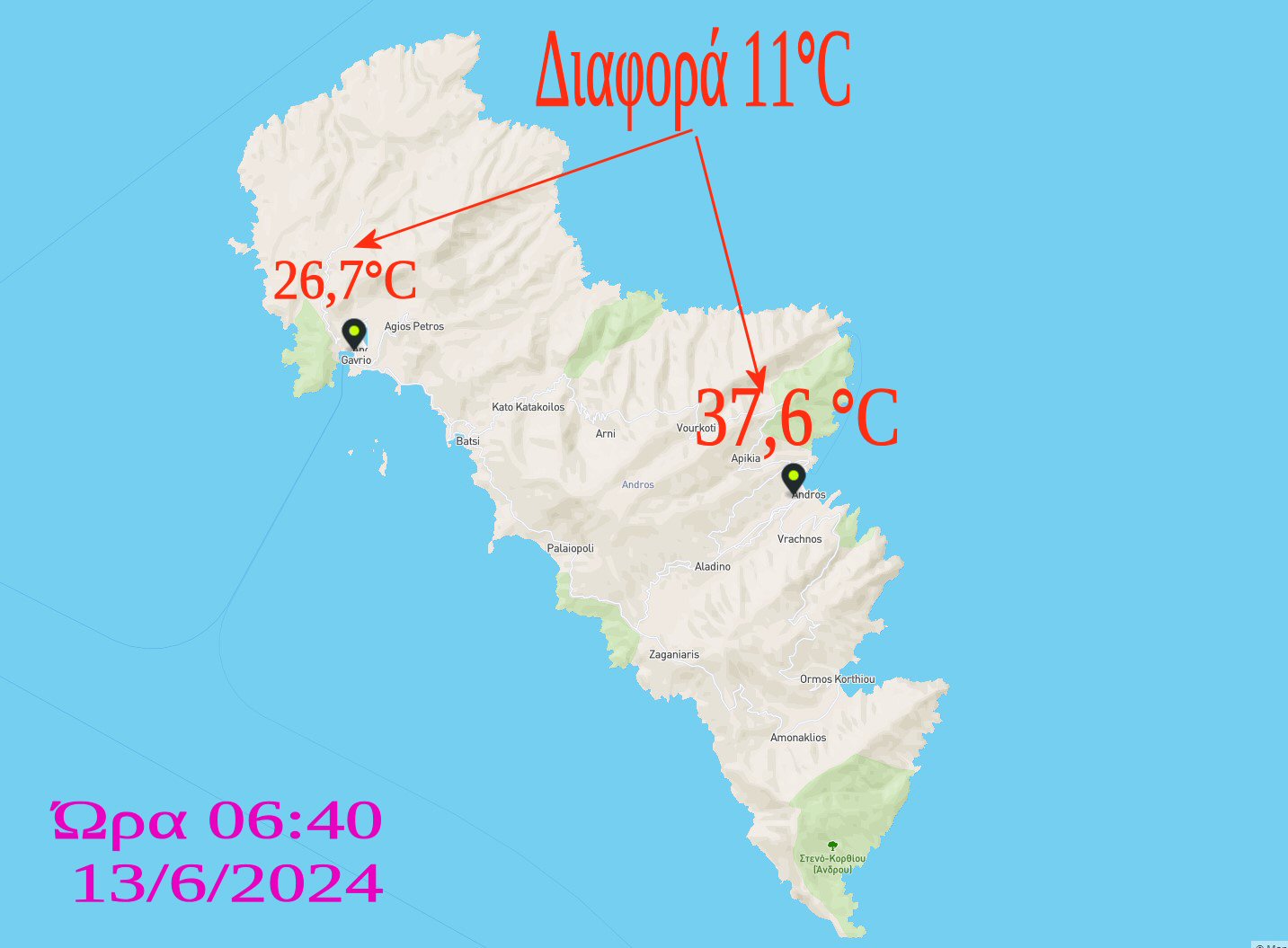 Σήμερα 13/6/24 στην Άνδρο στις 06:40 με δυτικό άνεμο, σημειώθηκε θερμοκρασιακή διαφορά 11°C, από τους μετεωρολογικούς σταθμούς ίδιου τύπου, που βρίσκονται στο Γαύριο (26,7°C) και τη Χώρα ( 37,6°C ) της Άνδρου.