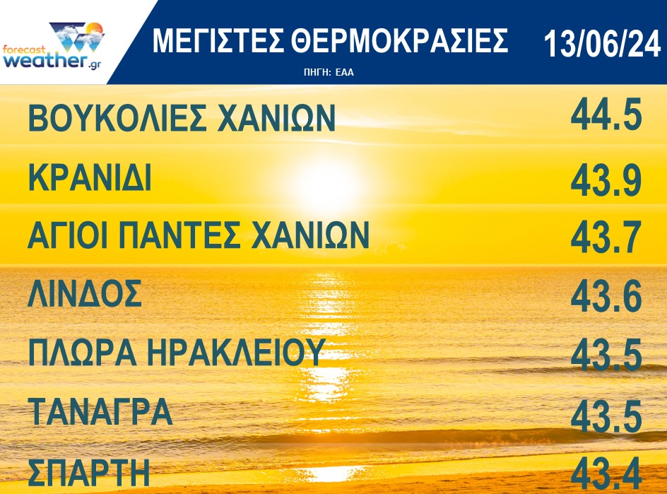 Στους 44 °C έφτασε η θερμοκρασία την Πέμπτη 13/06, ξεπέρασε τους 42 °C στην Αττική – 136 σταθμοί του https://t.co/YY2NjsL4dbΕ.Α.Α με θερμοκρασία πάνω από 40 °Chttps://t.co/Ud7ge2Xf15 pic.twitter.com/9yebwcpyWD