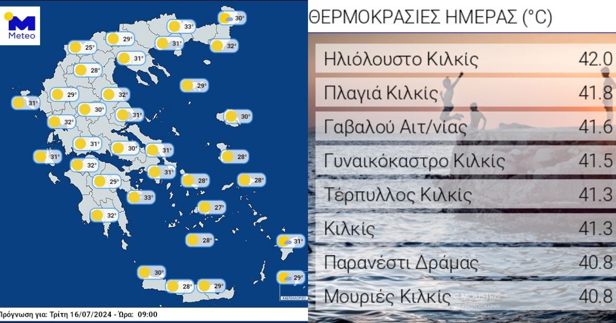 Πολύ υψηλές θερμοκρασίες καταγράφηκαν το μεσημέρι της Τετάρτης 15/07, κυρίως στα ηπειρωτικά τμήματα της χώρας. Η μέγιστη θερμοκρασία καταγράφηκε στο Ηλιόλουστο Κιλκίς (42.0 °C) και ακολούθησε η Πλαγιά Κιλκίς (41.8 °C) και η Γαβαλού Αιτωλοακαρνανίας (41.6 °C). Στον χάρτη της εικόνας που ακολουθεί παρουσιάζεται η κατανομή της μέγιστης θερμοκρασίας στη χώρα σύμφωνα με δίκτυο αυτόματων μετεωρολογικών σταθμών του Εθνικού Αστεροσκοπείου Αθηνών / meteo.gr.