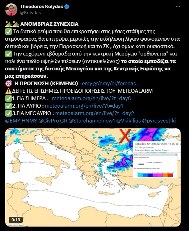 Ωστόσο όπως επισημαίνει από την επόμενη εβδομάδα, ένας αντικυκλώνας, που «ορθώνεται» από την Κεντρική Μεσόγειο θα εμποδίσει καιρικά συστήματα να επηρεάσουν την Ελλάδα.
