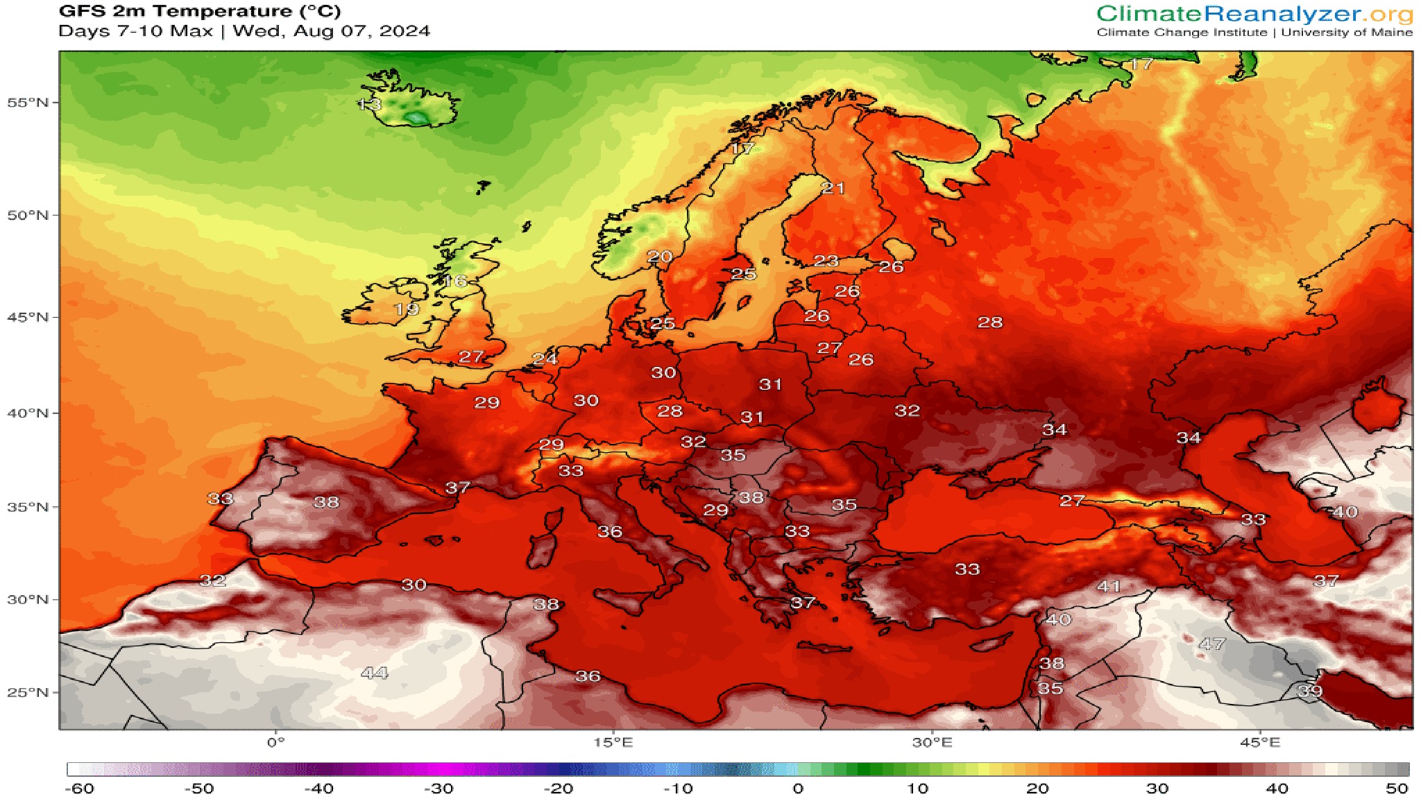 Θερμοκρασία: Από 23 έως 39 και πιθανόν τοπικά έως 40 βαθμούς και στις Σποράδες έως 32 με 33 βαθμούς Κελσίου.