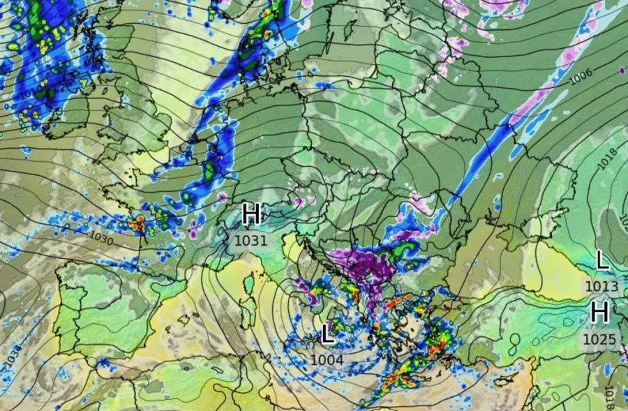 Με τις μωβ αποχρώσεις στον χάρτη των βαρομετρικών χαμηλών, οι περιοχές που θα σημειώνονται χιονοπτώσεις: