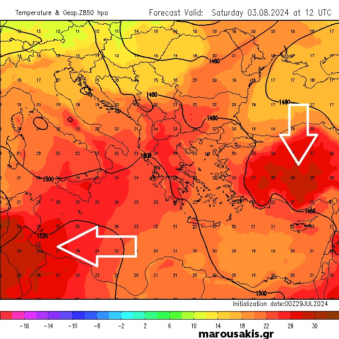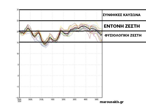 Στο 1ο μας διάγραμμα μπορείτε να δείτε τις καμπύλες κύμανσης της θερμοκρασίας όπου έχουμε επισημάνει με τις μαύρες γραμμές τα όρια κατά κάποιο τρόπο της ζέστης. Ενώ στον 2ο χάρτη σημειώνουμε με τα λευκά βέλη τους χρωματισμούς που οδηγούν σε καύσωνα και που σε καμία περίπτωση δεν απασχολούν τη χώρα μας.