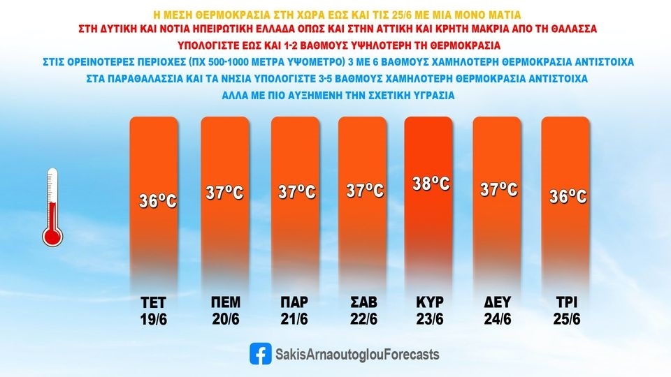 Σύμφωνα με τον Σάκη Αρναούτογλου, μέχρι 25 Ιουνίου δεν αναμένονται σημαντικές βροχοπτώσεις. Οι άνεμοι θα είναι ασθενείς στις περισσότερες περιοχές. Στο Αιγαίο, μελτέμια 6-7 μποφόρ (τοπικά 8 στις Κυκλάδες), με σταδιακή εξασθένηση από το Σάββατο. Μετά τις 25 Ιουνίου υπάρχουν ενδείξεις για άστατο καιρό στα δυτικά και ηπειρωτικά τμήματα της χώρας. Πιο συνοπτικά, ο καιρός θα παραμείνει ήπιος έως τις 25 Ιουνίου με λίγες βροχές και ασθενείς ανέμους. Από τις 25 Ιουνίου και μετά, υπάρχει πιθανότητα για άστατο καιρό στα δυτικά και ηπειρωτικά.