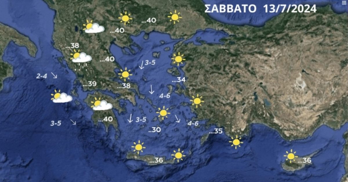 Καιρός – 1. Σήμερα Σάββατο (13-7-2024) η μέγιστη θερμοκρασία θα φτάσει: